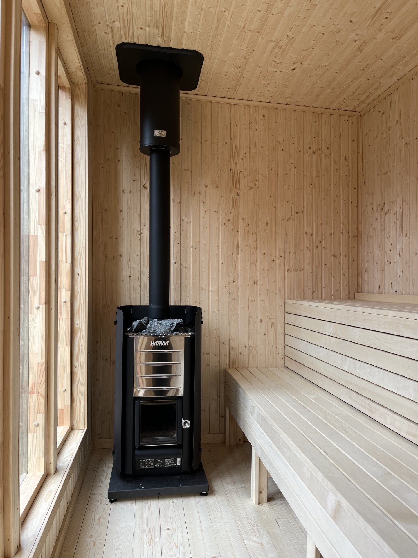 Ytterväggen med liggande panel, enkelfas spont i måtten 22x145 mm. Insidan är klädd med bastupanel av gran, 12x70 mm.