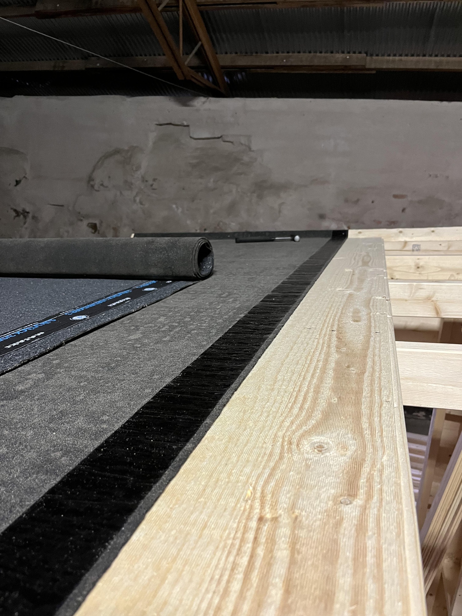Pulpettak med råspont i måtten 20x120 mm som är täckt med underlagspapp och ytpapp.